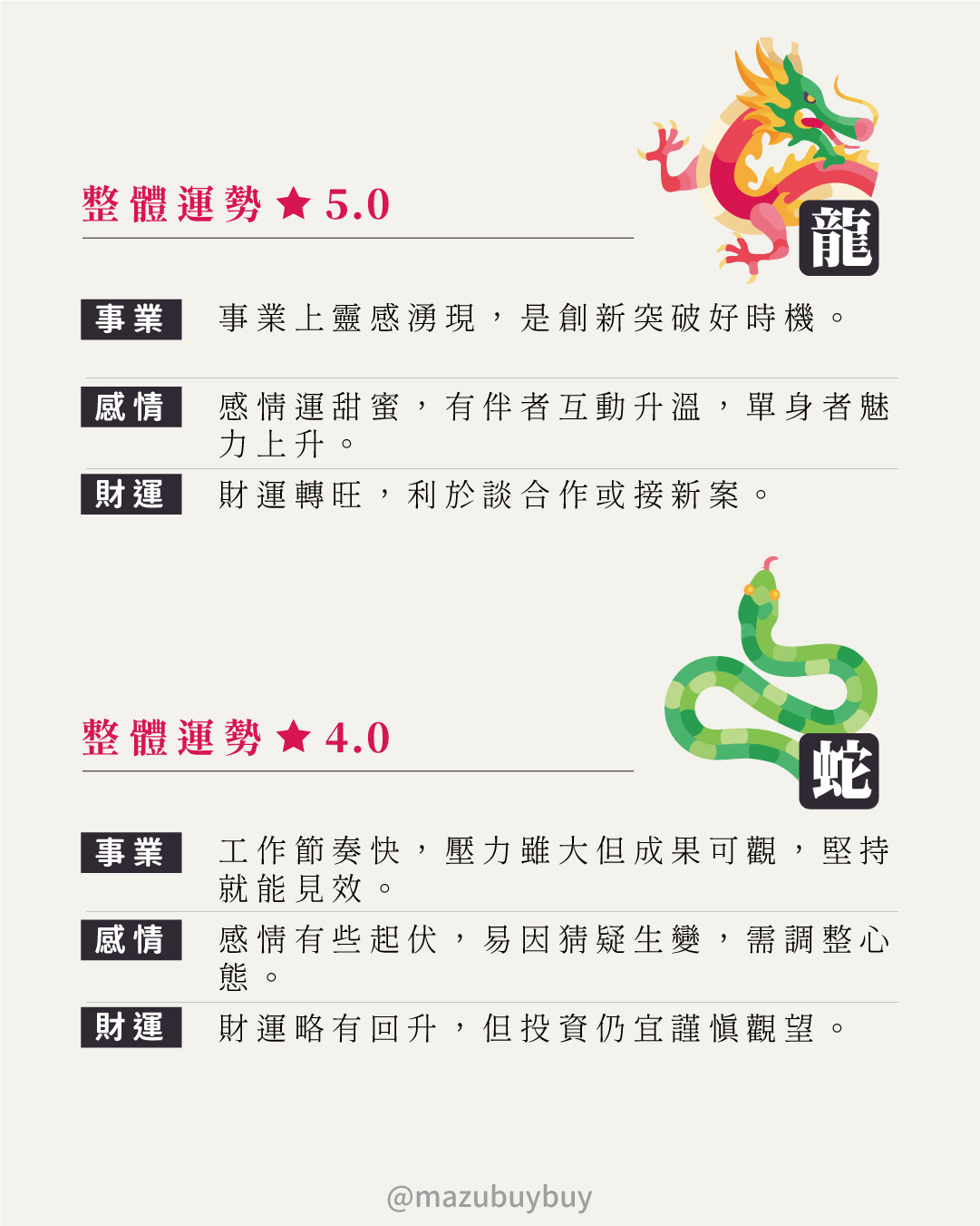 🐲 龍|創意滿滿、貴人多,事業愛情雙豐收。