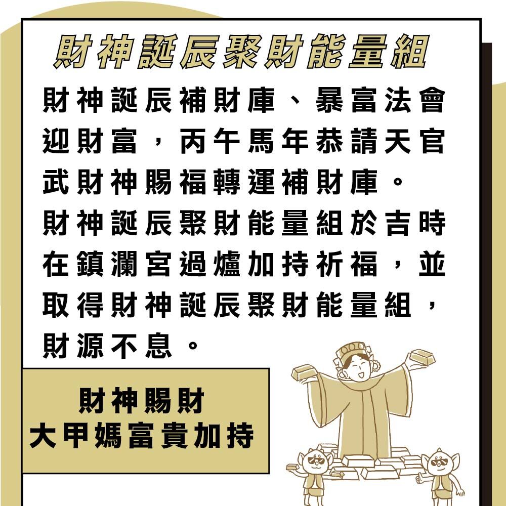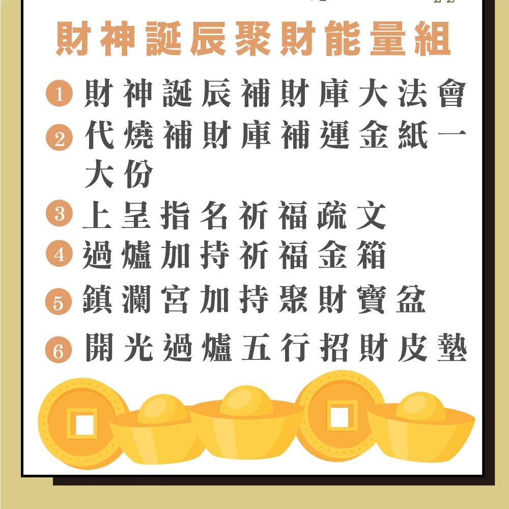 【財神誕辰聚財能量補財庫六件組】包含: