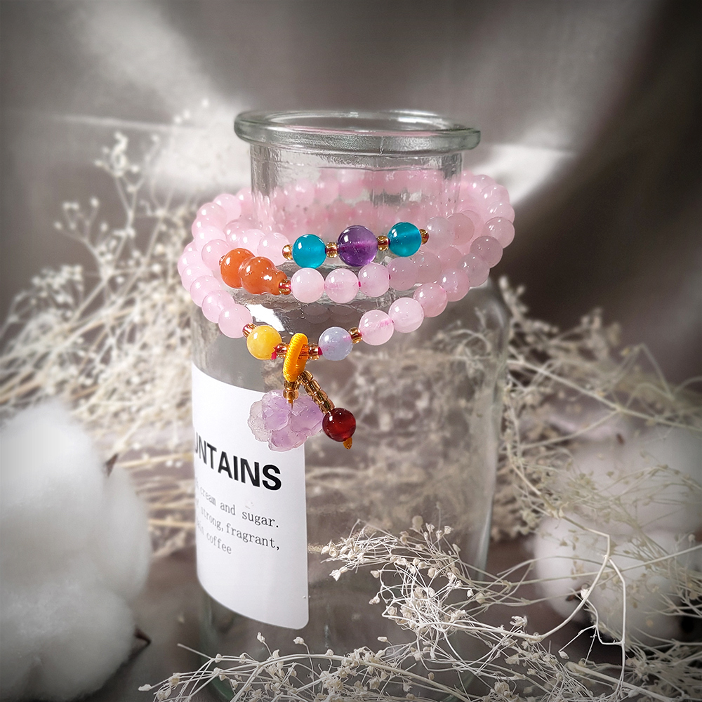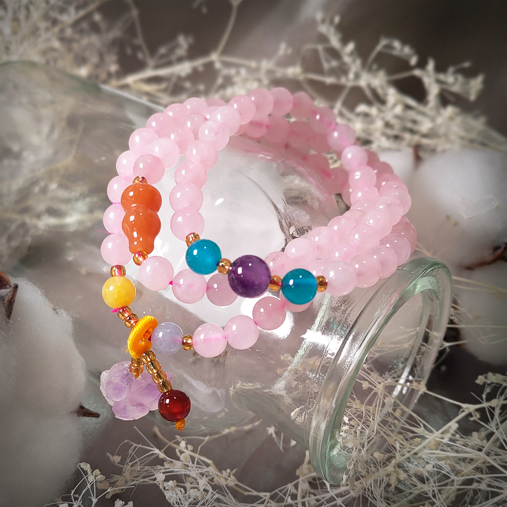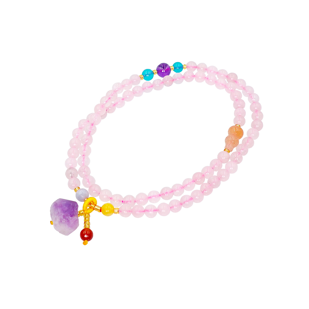 材質:粉晶珠6±1mm*78顆,紫水晶珠8±1mm*1顆,瑪瑙珠6±1mm*5顆,天然紫水晶原礦*1顆,石髓葫蘆14*8±1mm*1顆