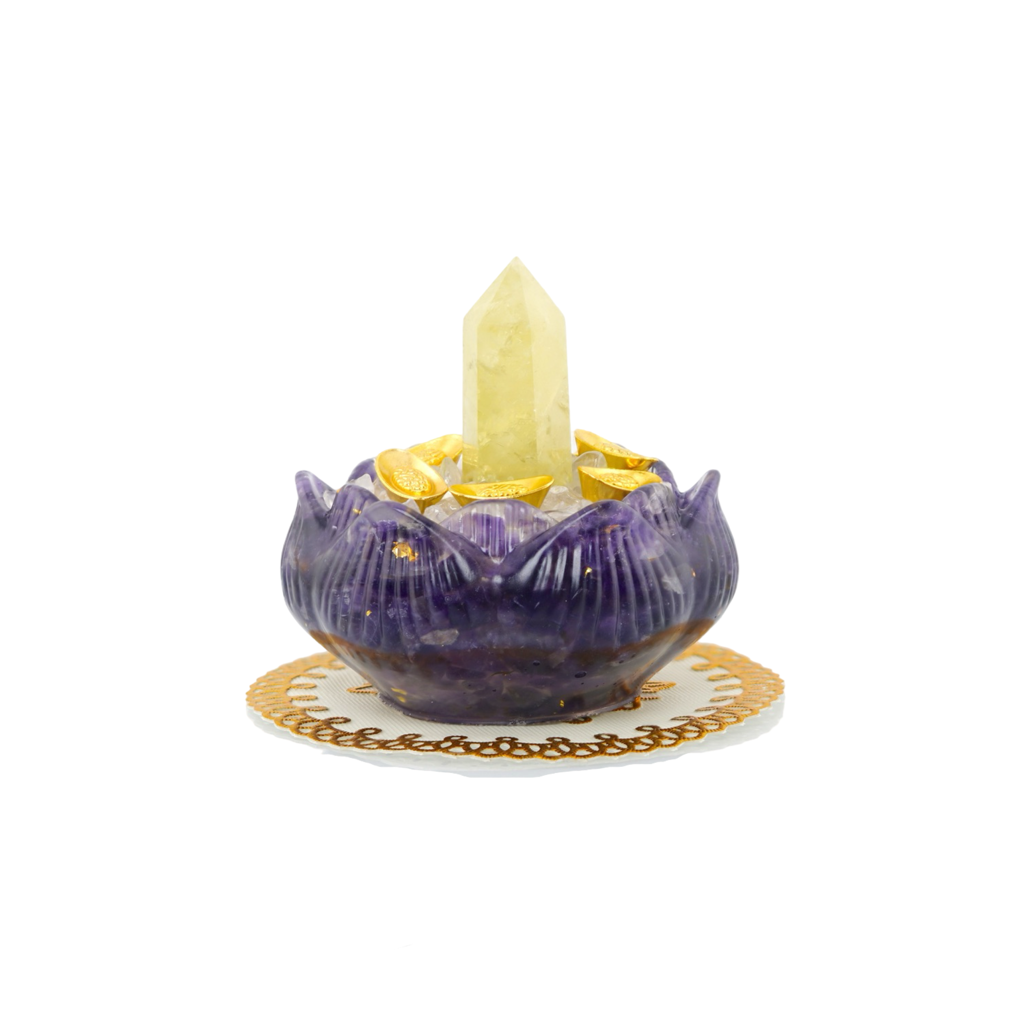 「財富加倍黃水晶柱聚寶盆」以紫水晶碎石製成的蓮花造型聚寶盆為底,