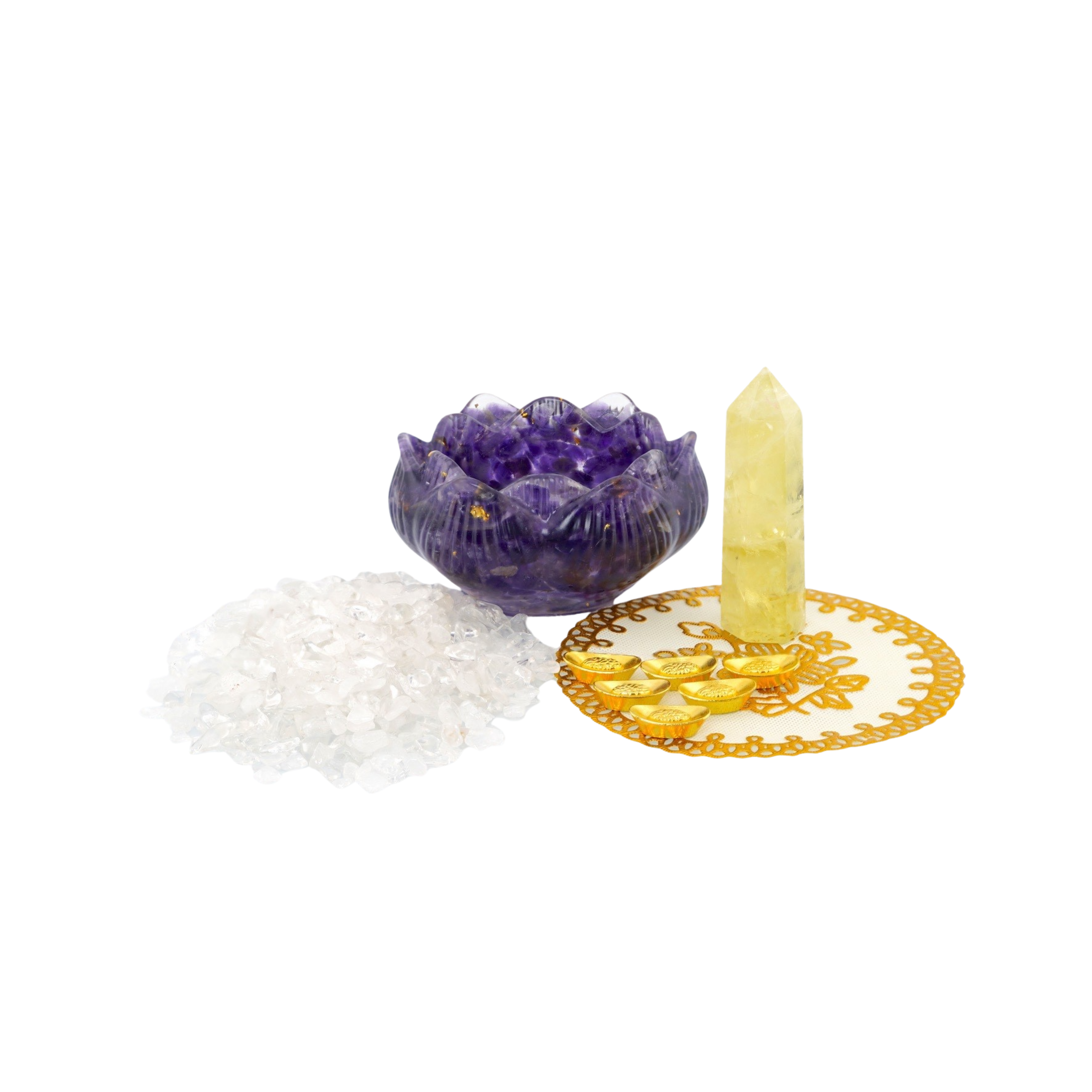 商品規格:材質:紫水晶碎石滴膠樹脂聚寶盆*1,黃水晶柱4-6cm*1,白水晶碎石100g,合金元寶6顆,PVC燙金墊子10cm*1