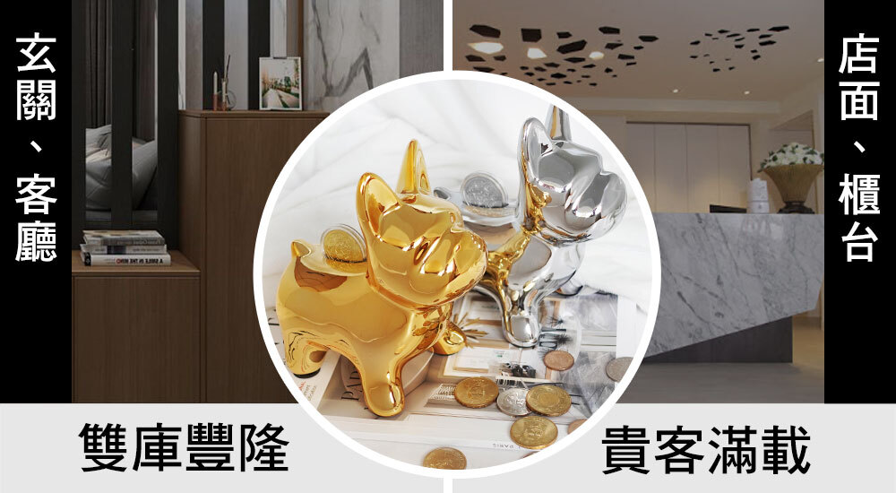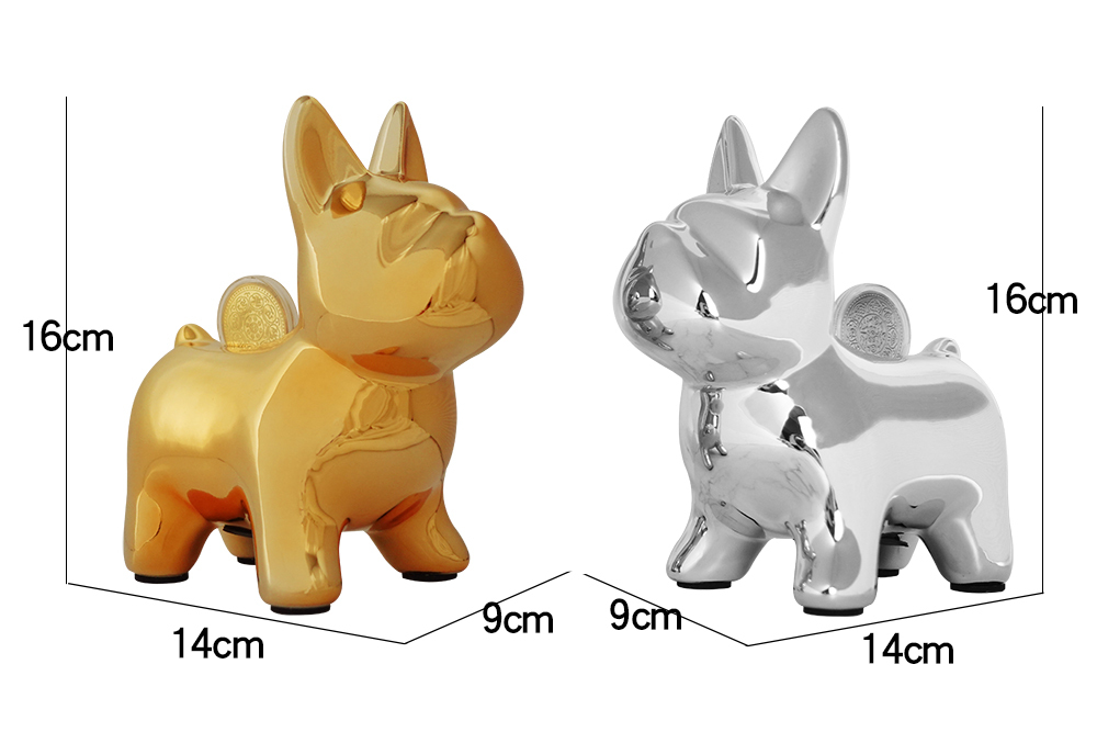 金銀財犬雙富貴存錢罐x1:強化瓷+電鍍工藝。單隻尺寸約:14*9*16cm。(一金一銀)