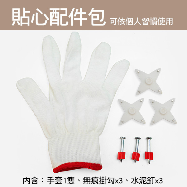 配件包:手套x1雙、水泥釘x3只、無痕釘(掛勾)x3只。