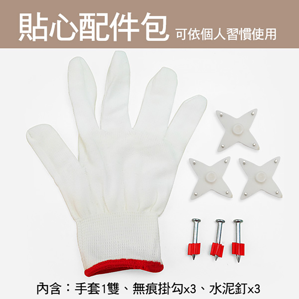 手套x1雙、水泥釘x3只、無痕釘(掛勾)x3只。