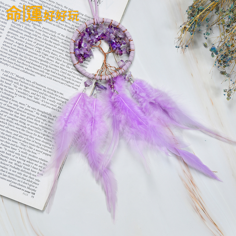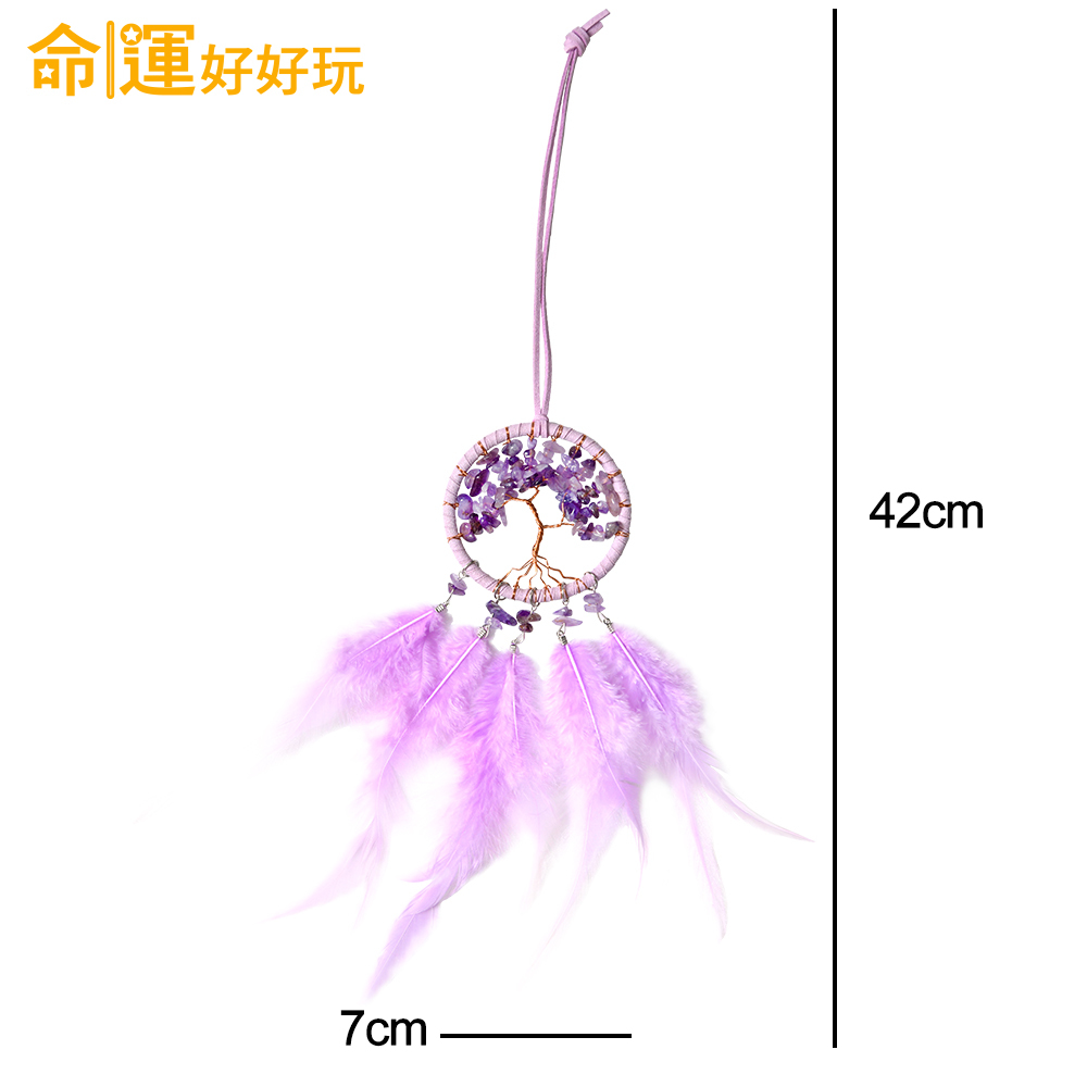 優化紫水晶、皮繩、染色真羽毛、銅絲。總長約43cm,網子直徑約7cm、水晶樹枝12枝、羽毛串長約15-19cm(一組5串)。