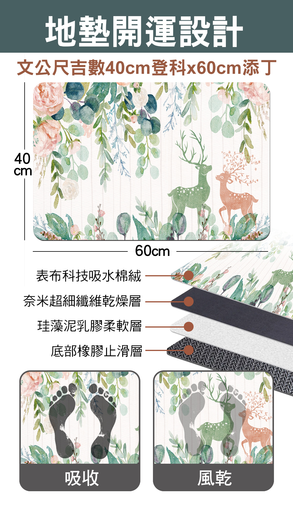 吸水科技布+仿棉绒+硅藻土橡膠軟墊。約40*60cm,厚約4mm。