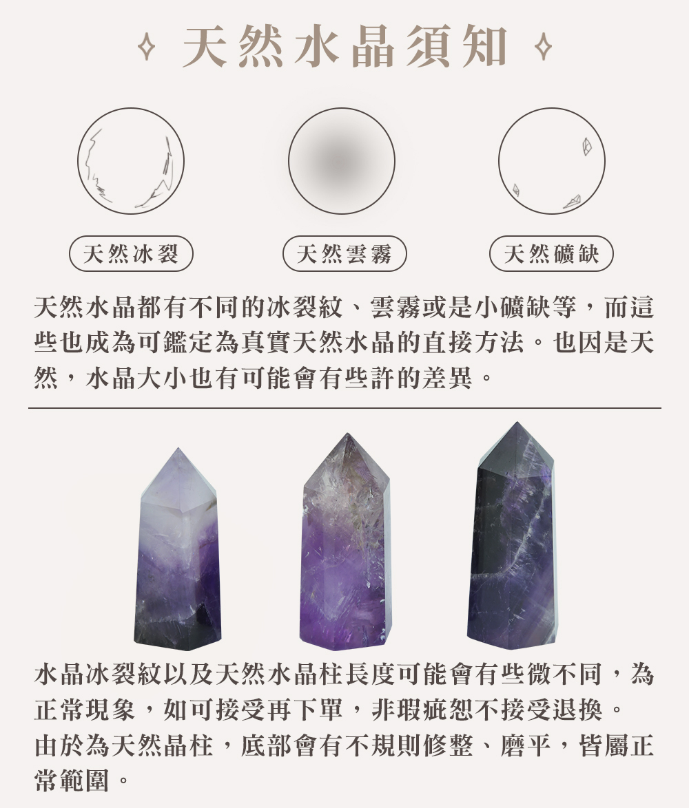 優化紫水晶。直徑約3cm*高約7-8cm。(水晶有冰裂紋、礦坑、雜質等狀況為天然形成的現象,非瑕疵恕不接受退換。)