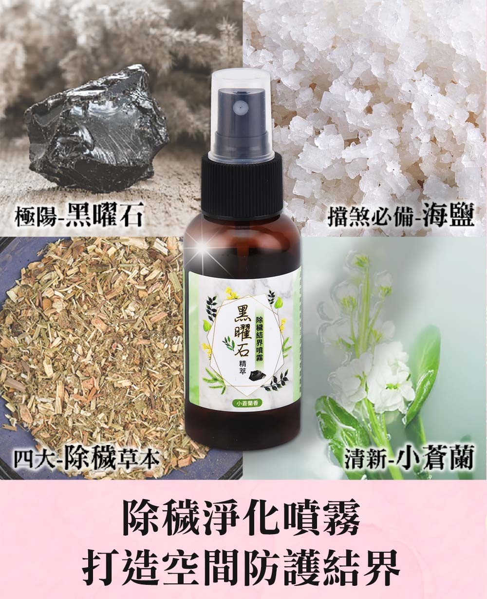 黑曜石精萃˙除穢結界噴霧x1瓶 D.I. Water、Alcohol Denat、Fragrance(小蒼蘭、艾草、抹草、蓮花、榕樹葉)