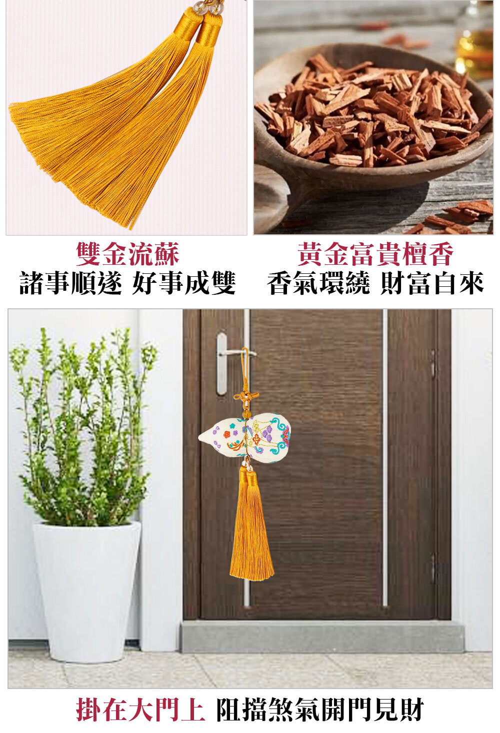 財鹿葫蘆除穢包x1入 滌綸、絲線、玻璃珠、太歲符紙。總長約33cm、重量約30g、主體長10cm*寬5cm*高5cm。上面噴檀香味,內含太歲符。