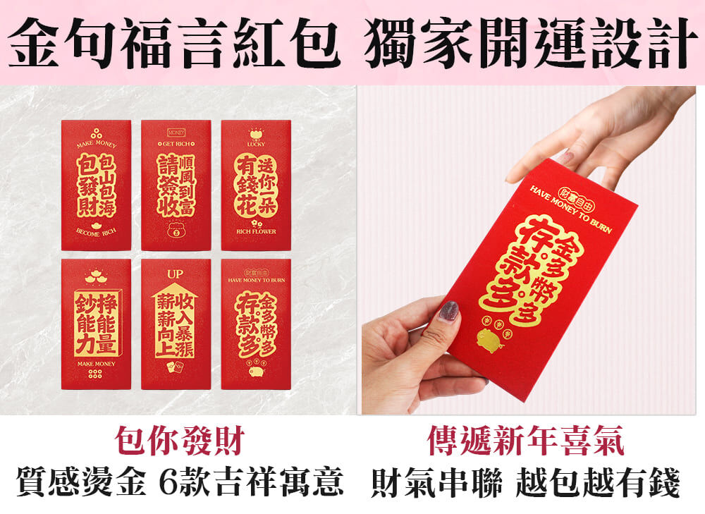 金句福言紅包x6入 金蔥紙+燙金工藝。每張長16.7cm*寬9cm。