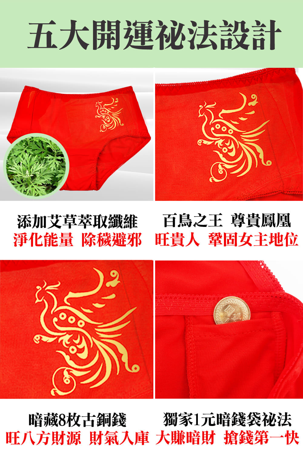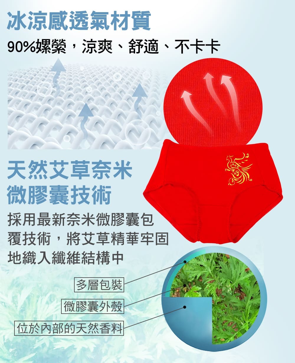 鳳凰來儀開運紅內褲x6入 90%嫘縈(含艾草成分),10%彈性纖維。