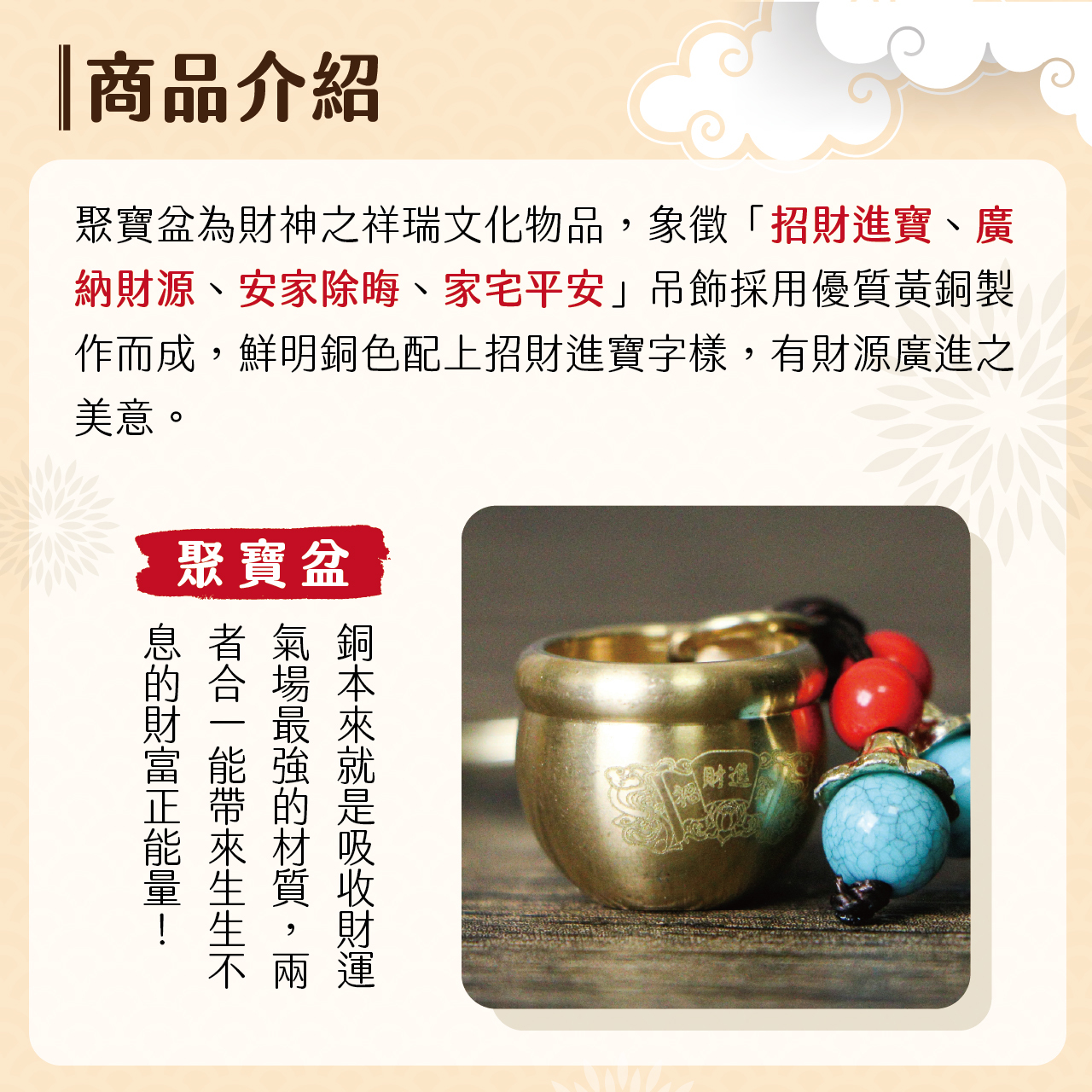 此吊飾聚寶盆採用黃銅製作