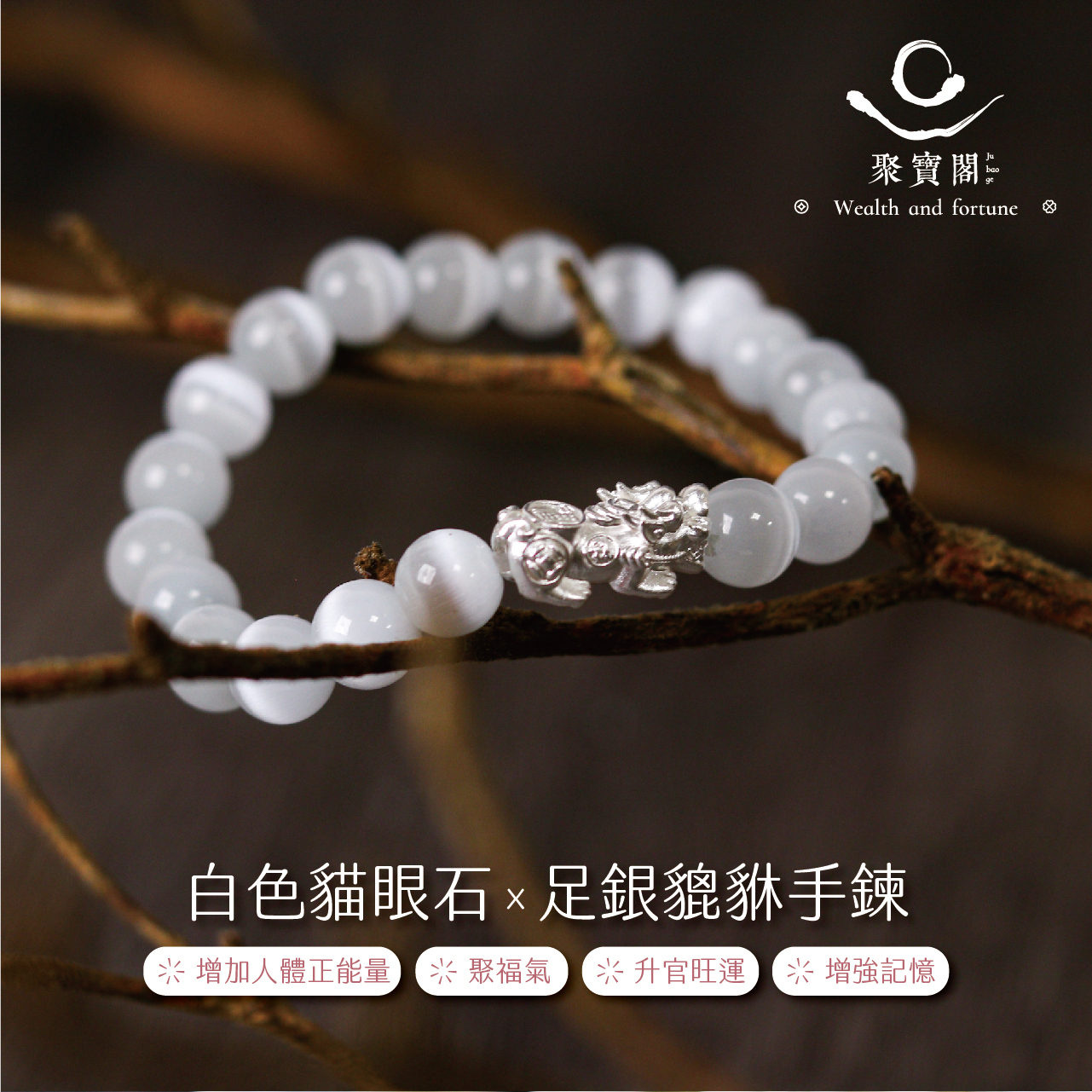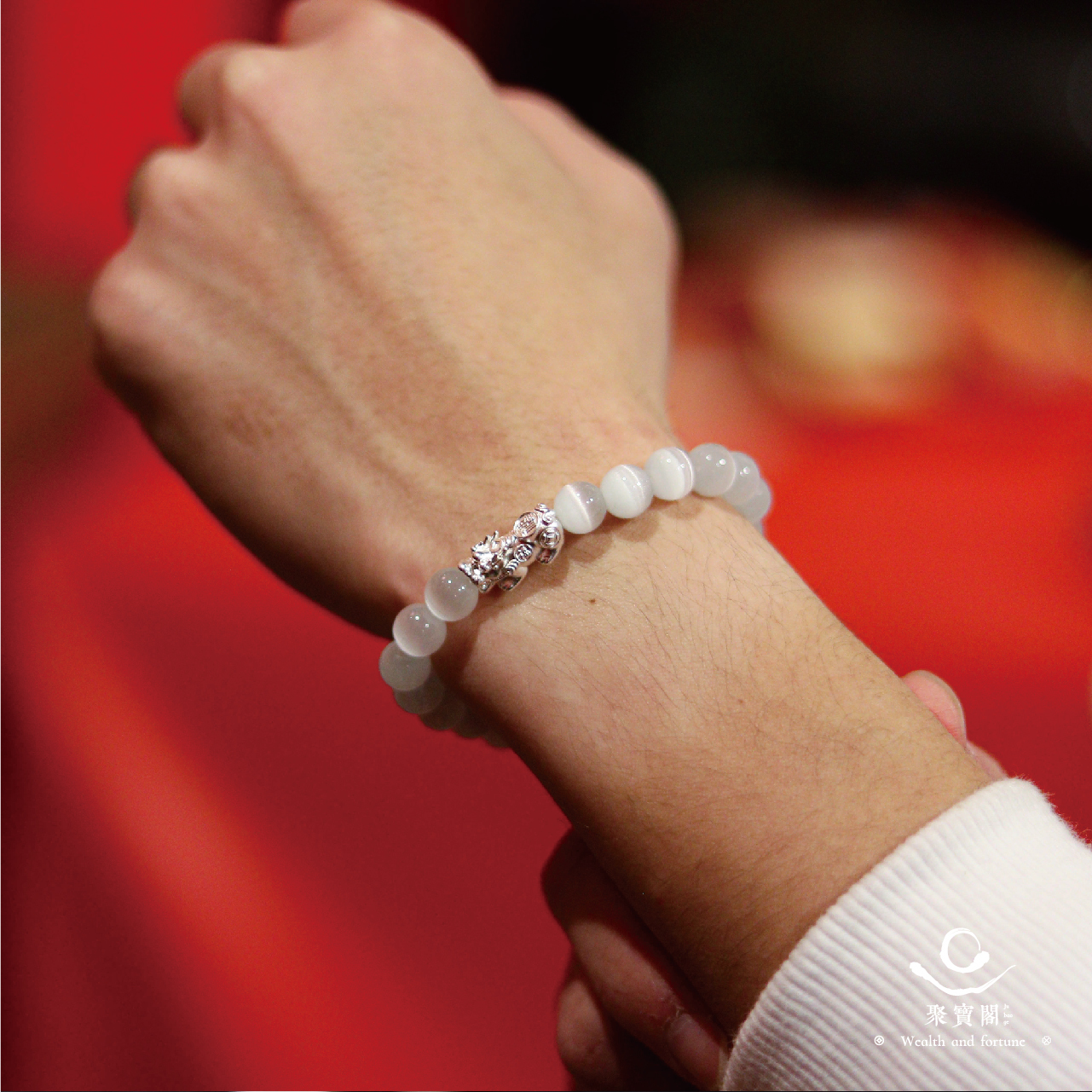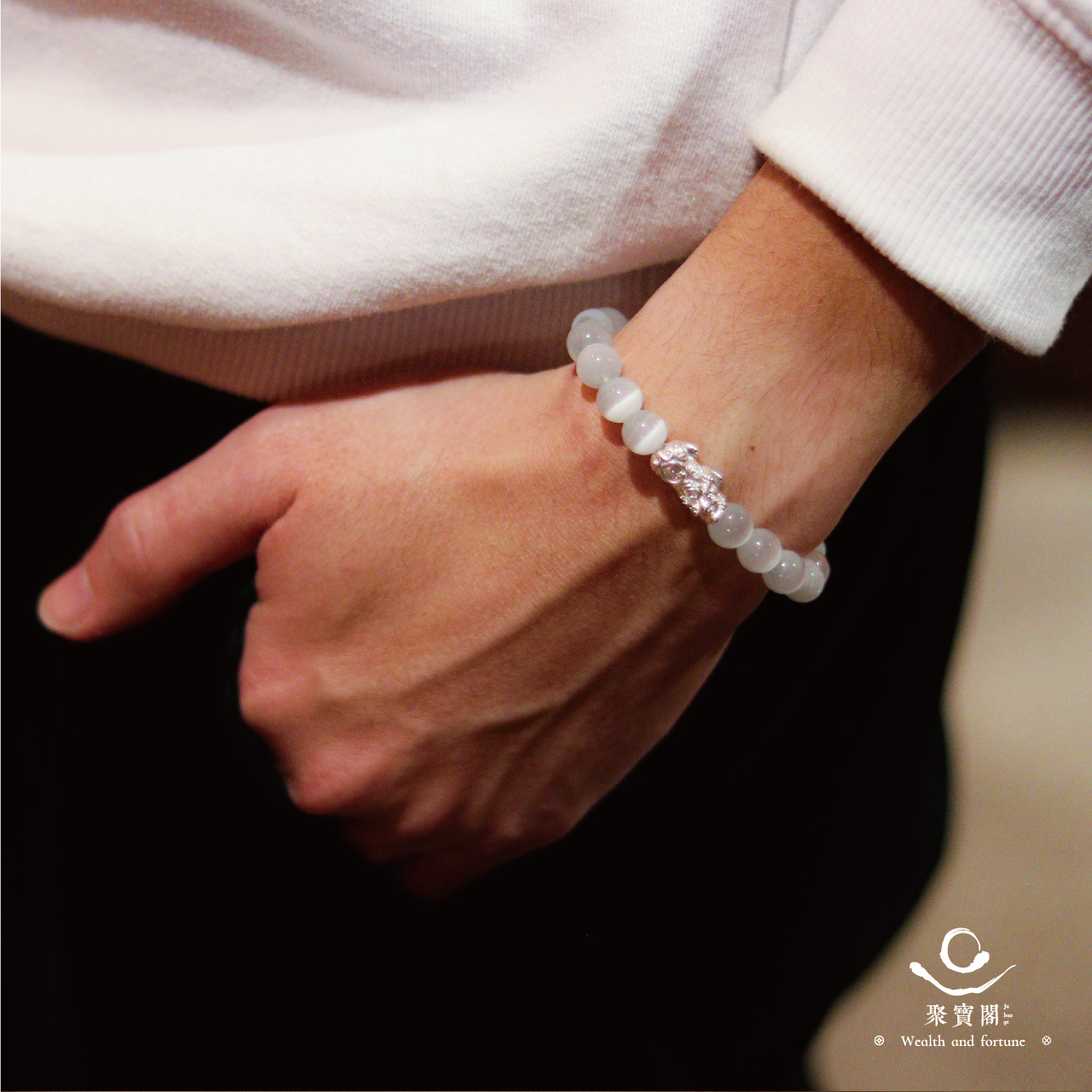 白色貓眼石x純銀貔貅手鍊|增加人體正能量|升官旺運【聚寶閣】