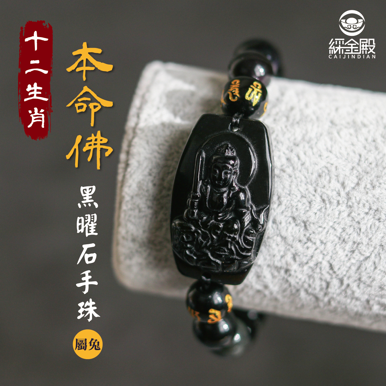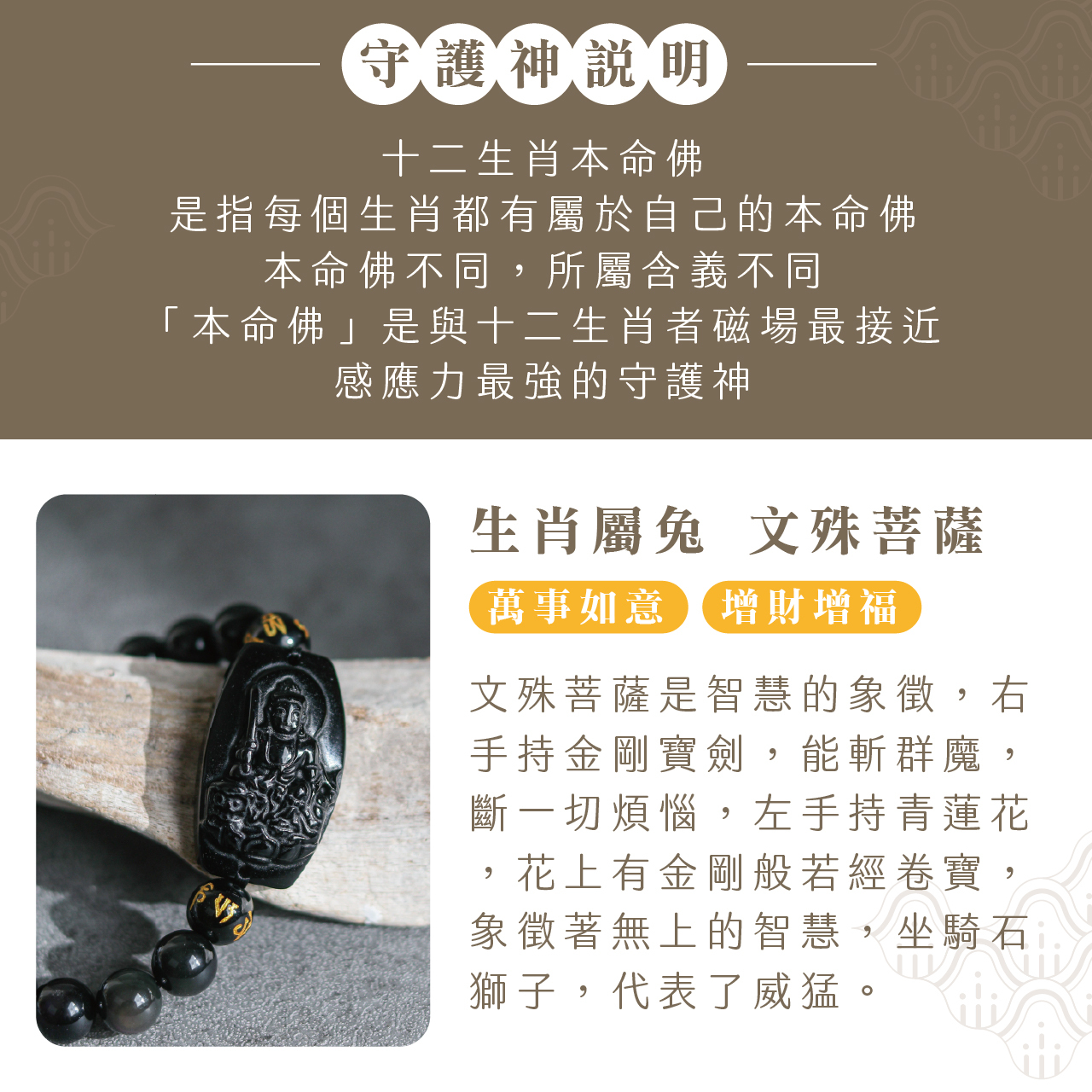 生肖兔、本命佛(文殊菩薩)黑曜石手珠|萬事如意|增財增幅|手鍊|過爐加持【綵金殿】