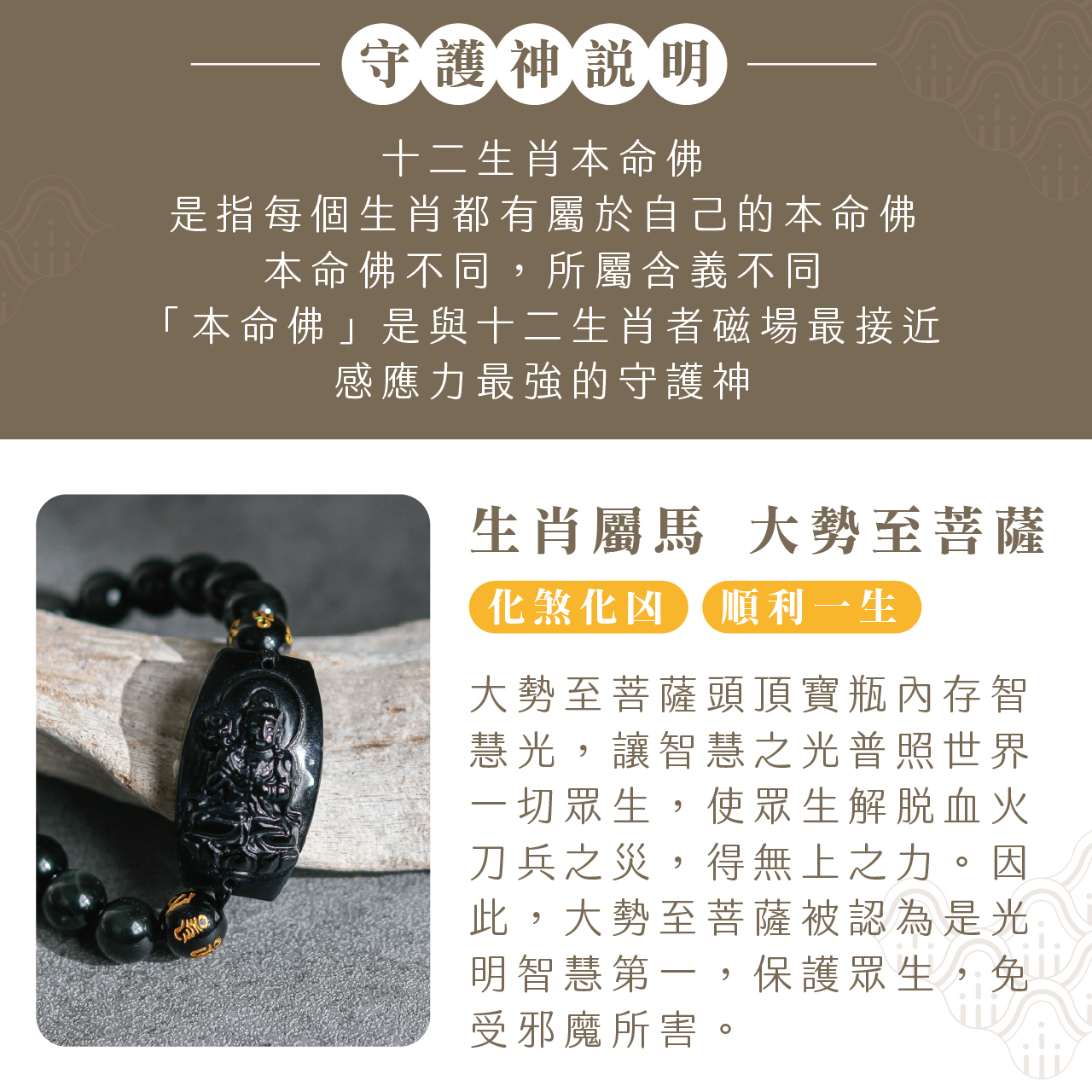 生肖馬、本命佛(大勢至菩薩)黑曜石手珠|化煞化兇|順利一生|手鍊|過爐加持【綵金殿】