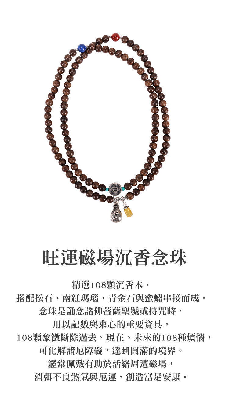 ●材質:6±2mm沉香木×108顆,3±2mm優化松石×2顆,7±2mm南紅瑪瑙×1顆,7±2mm青金石×1顆,6±2mm蜜蠟×1顆(顏色隨機),金屬配件S925