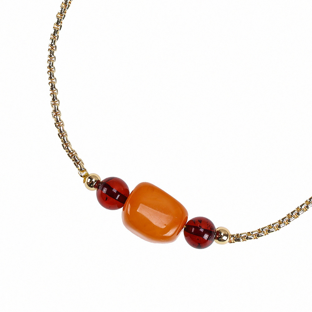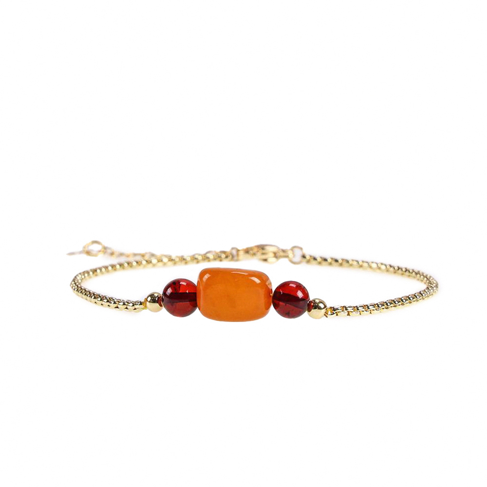 「天然隨形吉祥老蜜蠟手鍊」以隨形老蜜蠟和血珀串聯而成,血珀色澤醇厚飽滿,溫暖且迷人,血珀有助調養氣血;