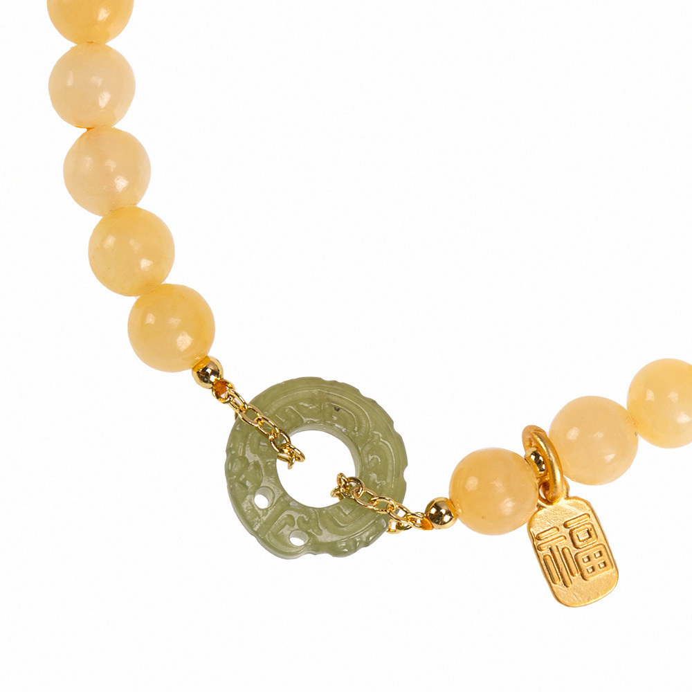 「圓滿聚福黃玉手練」以黃玉與和田玉串聯而成,和田玉又被稱為「崑崙玉」,象徵吉祥健康、長壽多福,