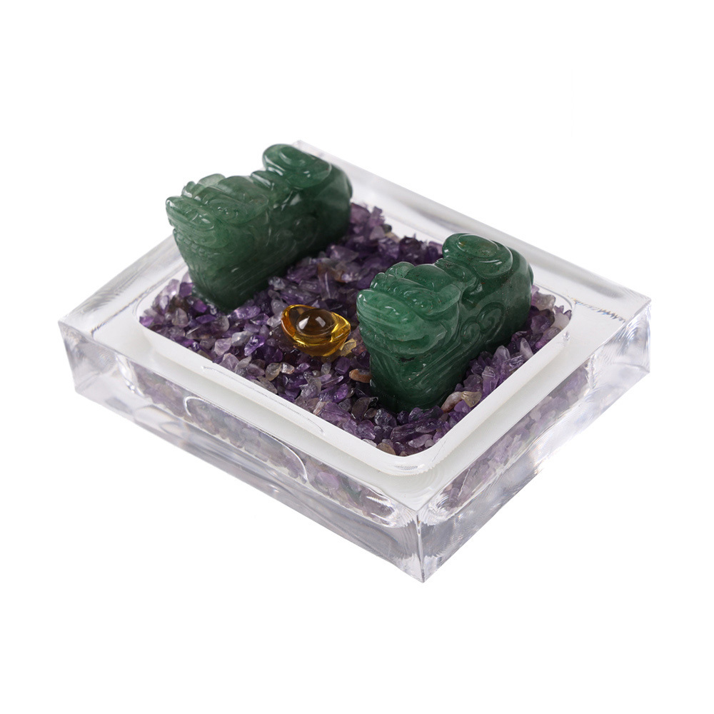 以溫潤碧綠的東菱玉精雕出栩栩如生的一對貔貅,公貔貅主招財、母貔貅主守財,有助進財穩定,並鎮守財庫,