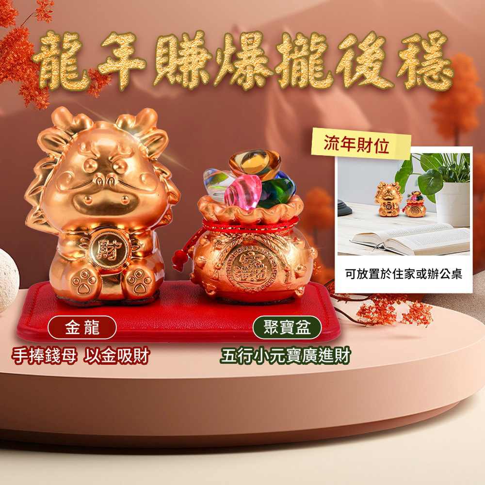 2024甲辰龍年要讓你都有賺錢,有財庫!所以在甲辰年特別設計的「金龍暴賺五路聚財鎮」,龍本身代表尊榮與吉祥的含意,金龍手捧「財」字錢母