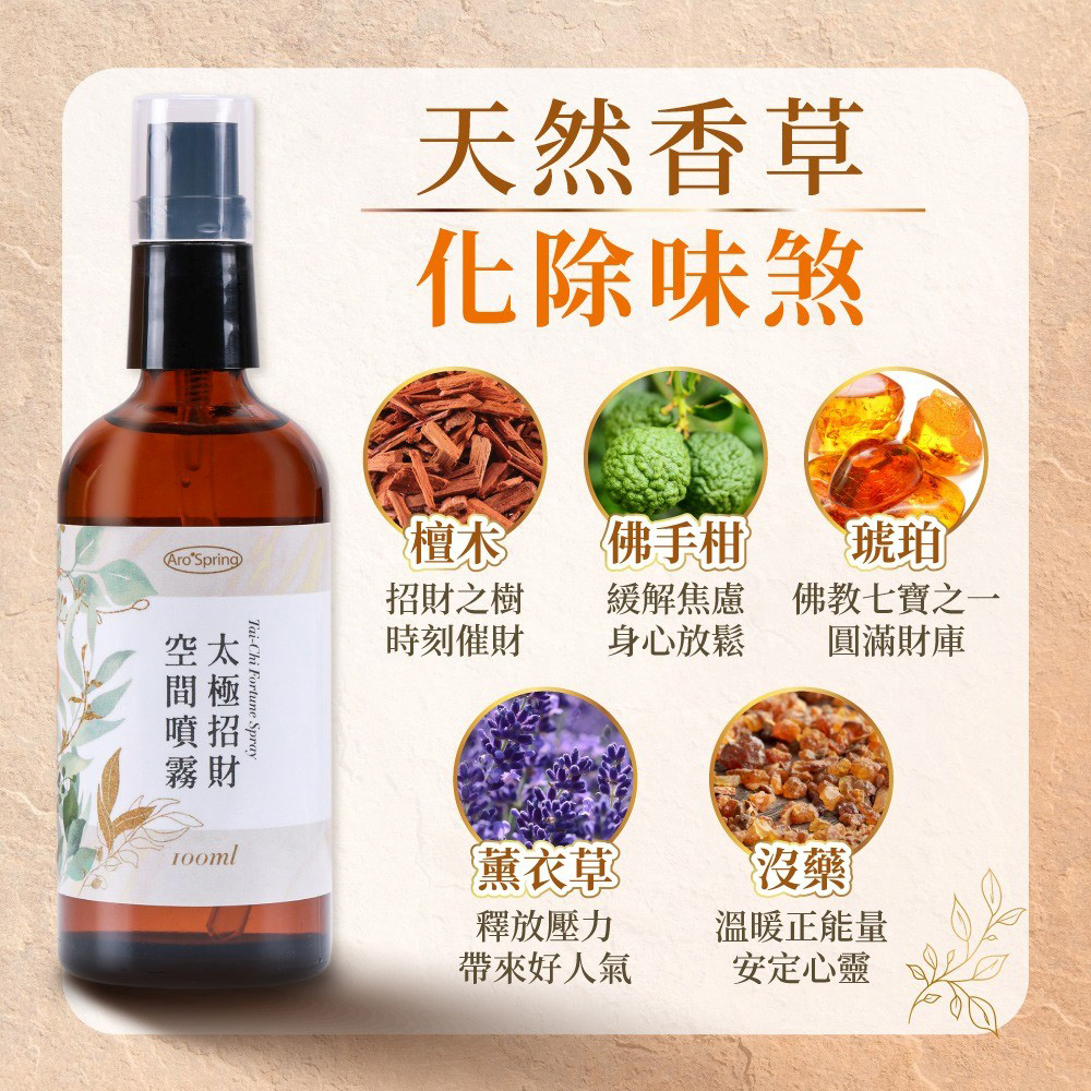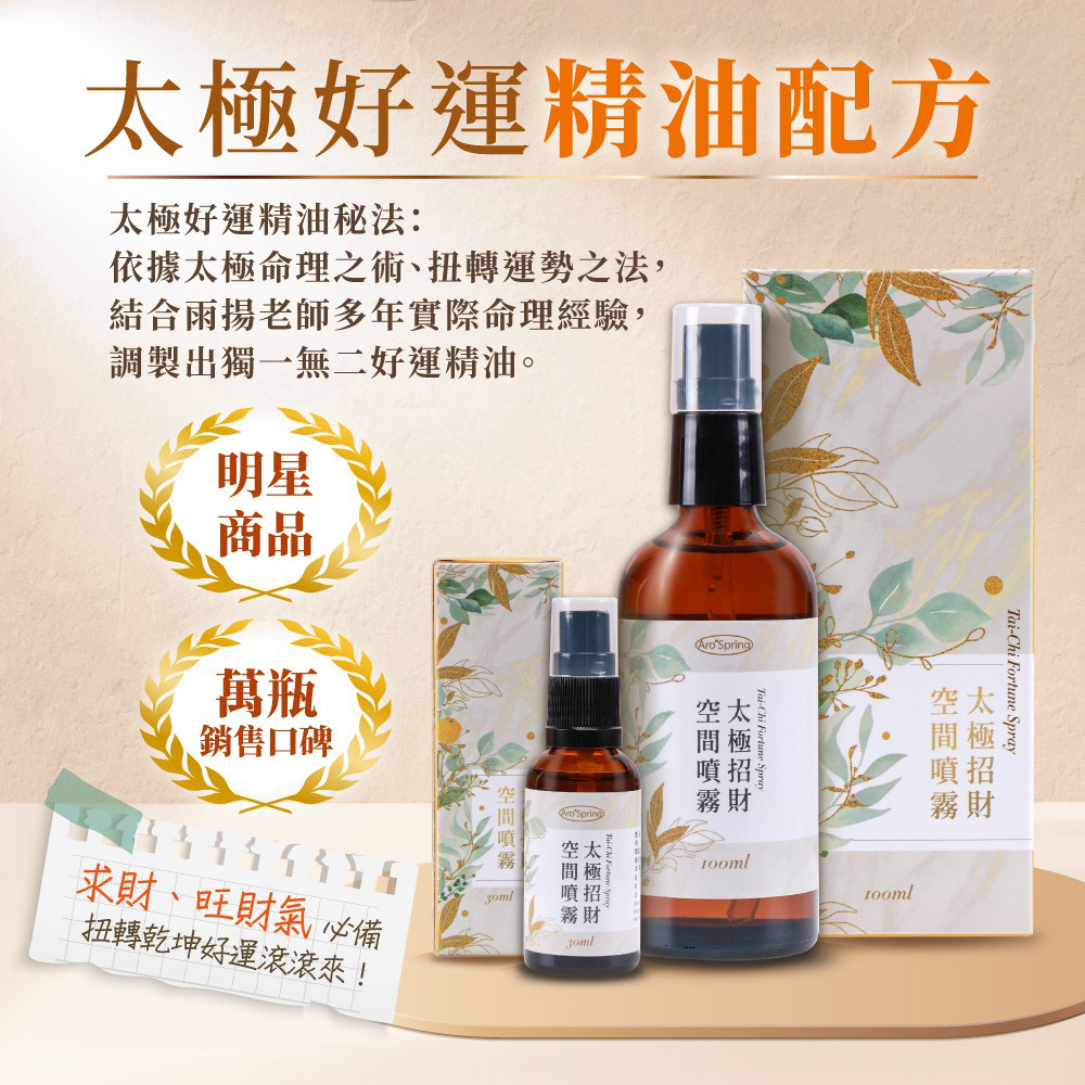 噴霧內含獨家太極好運香精油配方,太極不僅代表陰陽調合,萬事好合,更諧音「賺錢(台語)」