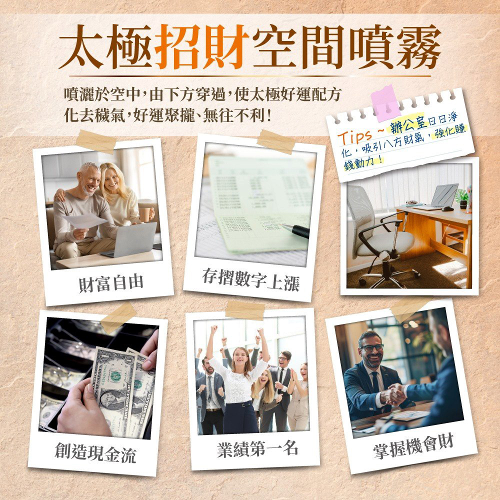 經常使用「太極招財噴霧劑30ml(新版)」有益於強化招財能量,凝聚富貴財氣,讓您隨時隨地都充滿賺錢的朝氣與活力!