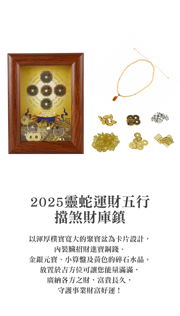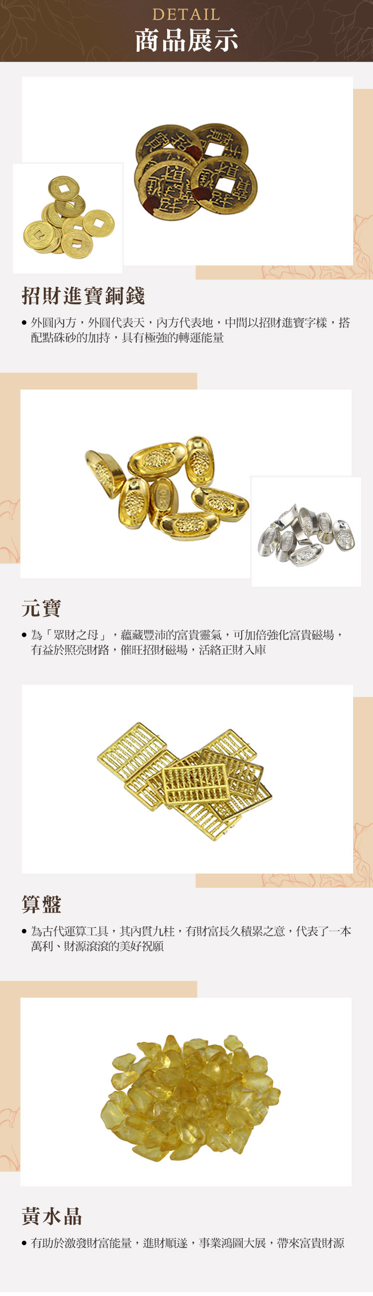 ●材質 : EPS發泡材料、木紋皮、壓克力、紙、銅、合金、招財進寶銅錢(點硃砂)10枚(另5枚需黏好在紙上)