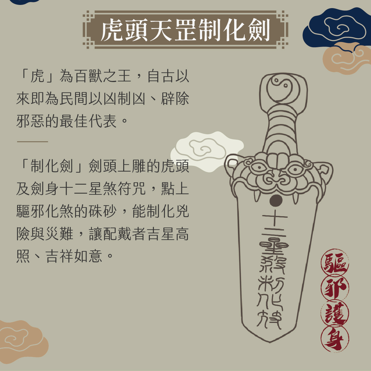 劍頭上雕的虎頭及劍身刻有十二星煞制化符
