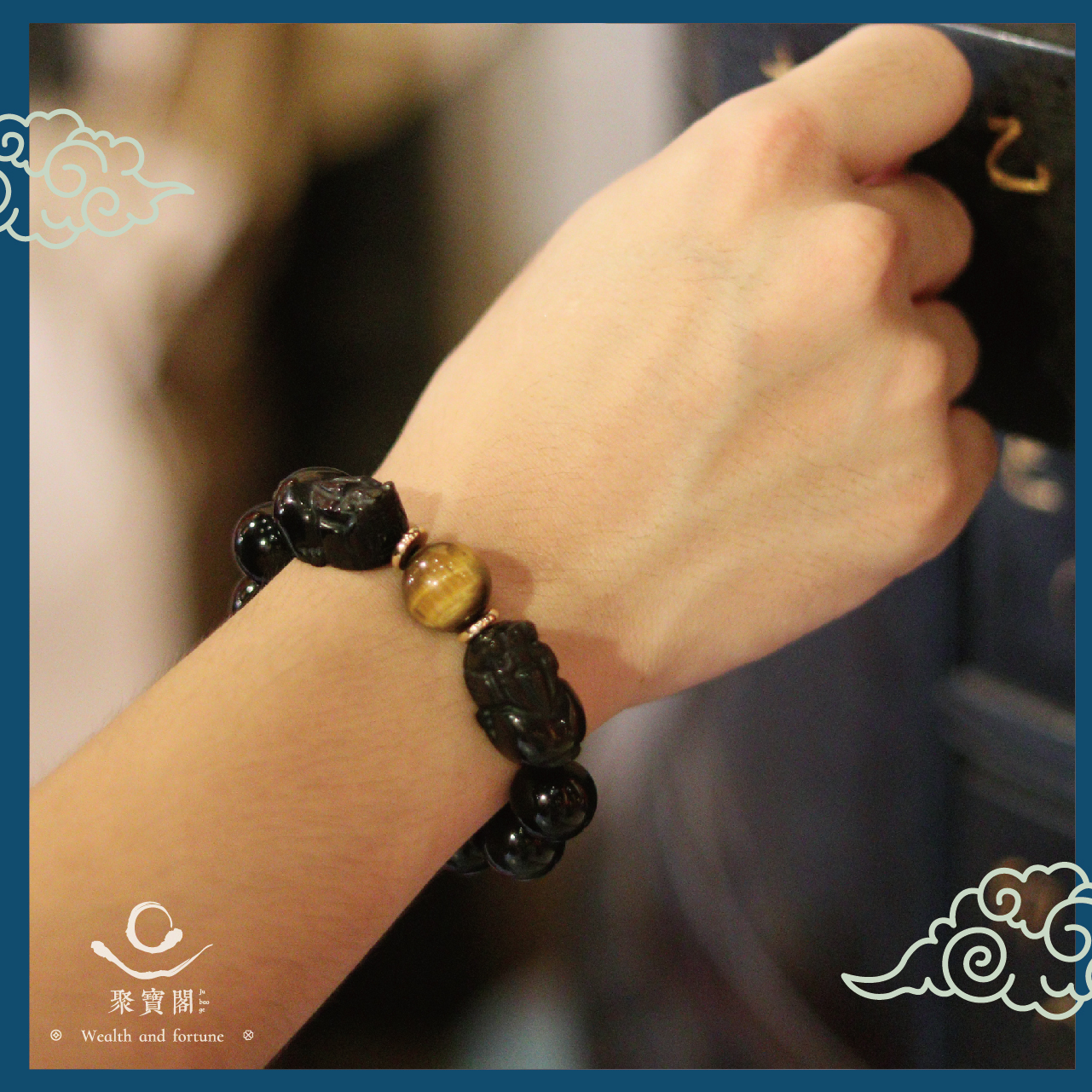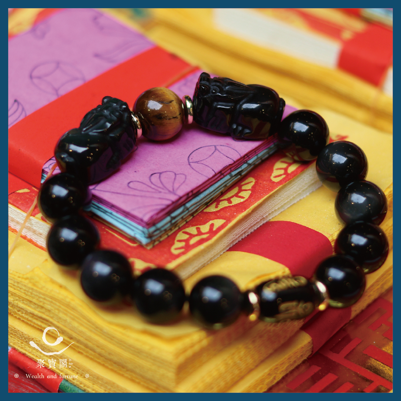招財雙貔貅虎眼石手鍊(六字箴言)-14mm|招財|防小人|擋煞| 避邪【聚寶閣】
