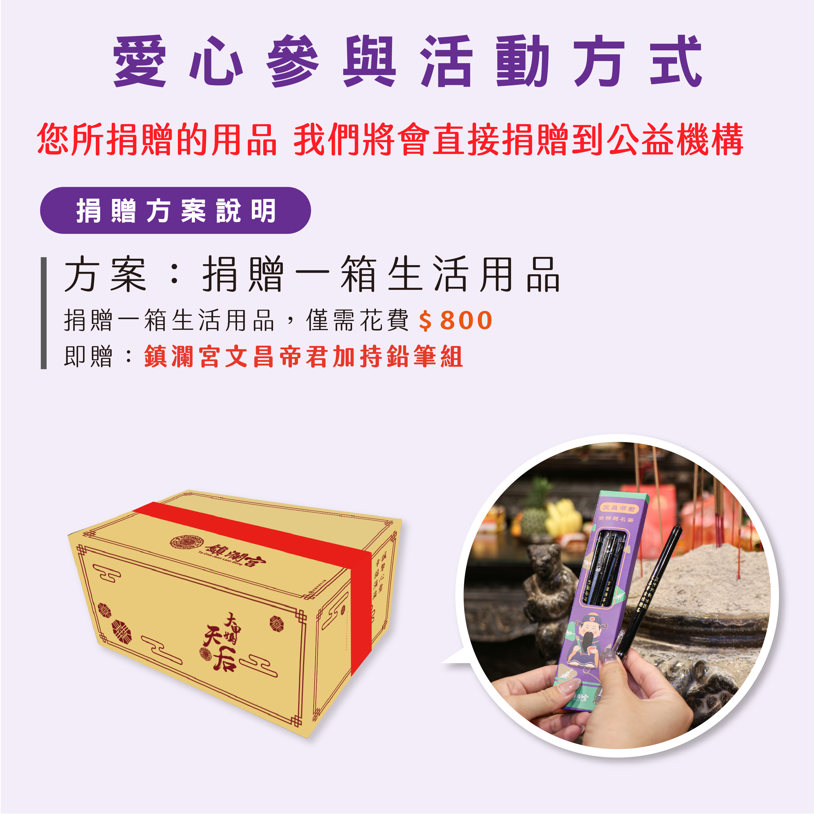 每捐一份生活用品箱,您將會收到一個2024限定過爐加持的「文昌帝君鉛筆組」
