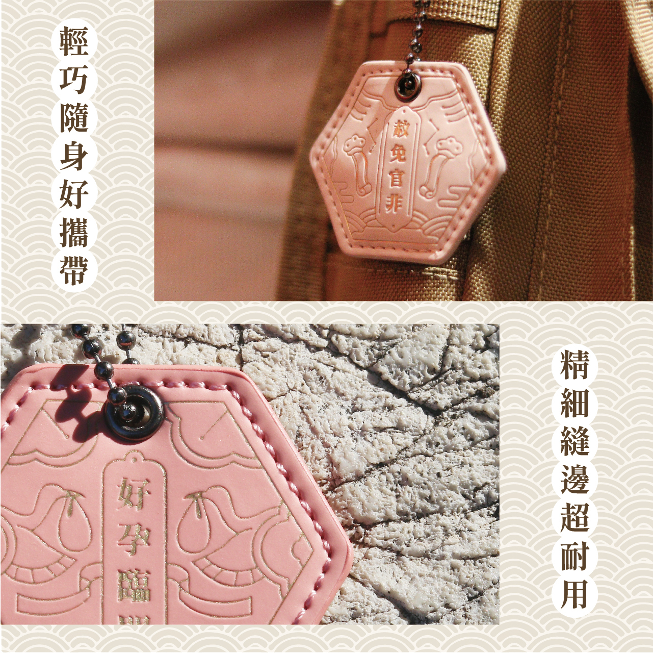 利用皮革工藝製作的護身符,結合八卦符令的外型延伸設計