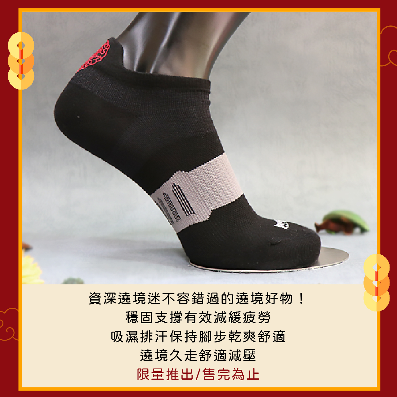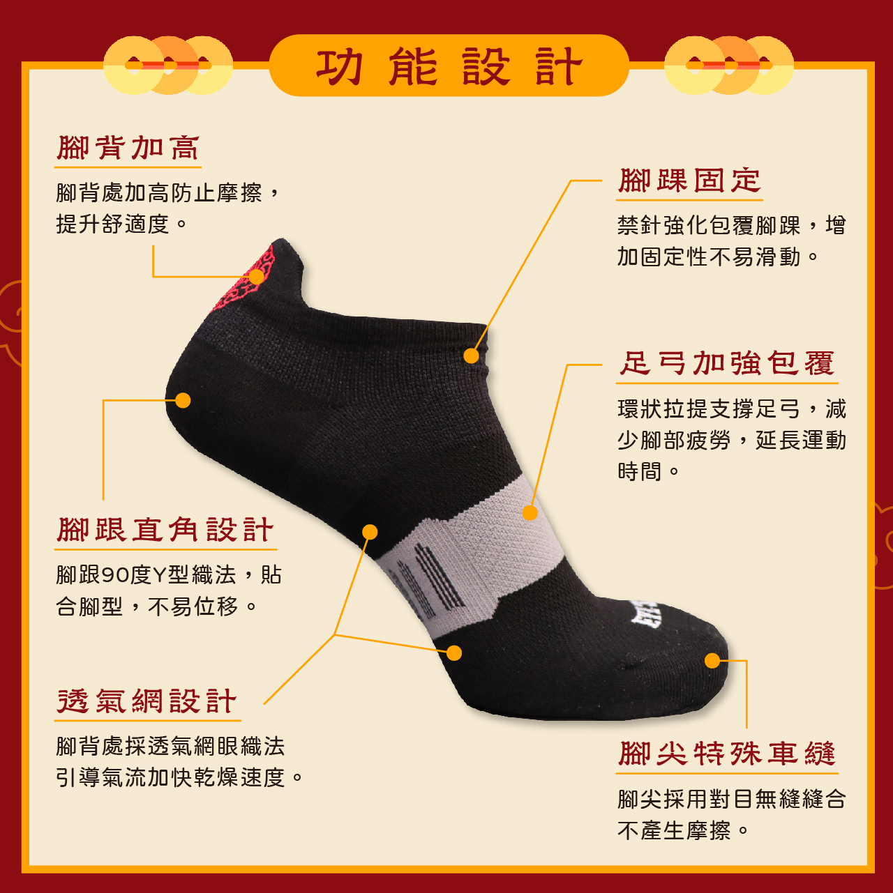360度足弓包覆/透氣網眼設計